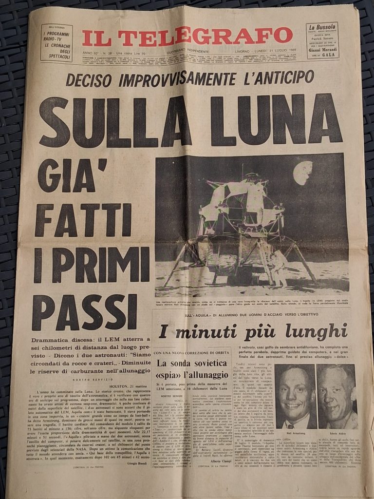 Io ero troppo piccolo per ricordarlo, e mia moglie stava per nascere. Ma in casa ho trovato vecchi quotidiani e riviste di quei giorni, gelosamente conservati. Sfogliando il numero de Il Telegrafo del giorno dopo, mi sono immerso in quell’atmosfera di entusiasmo collettivo, tra titoli a tutta pagina e cronache dettagliate dei momenti più concitati. C’era il comandante che, con un gesto di coraggio e sangue freddo, tolse il pilota automatico e prese il controllo manuale del modulo per evitare un’area troppo rocciosa. E c’era persino una navicella sovietica che cambiò rotta per “spiare” da vicino la missione americana.
